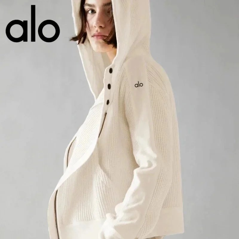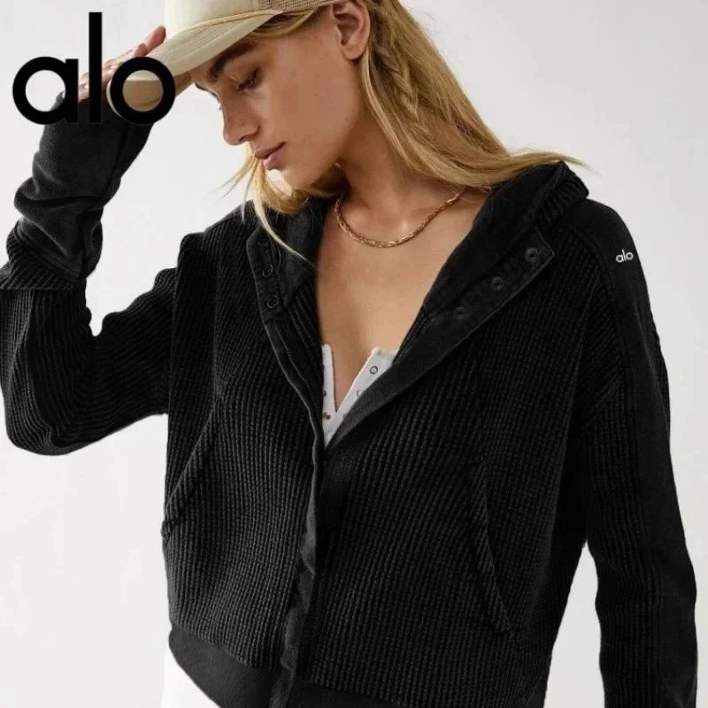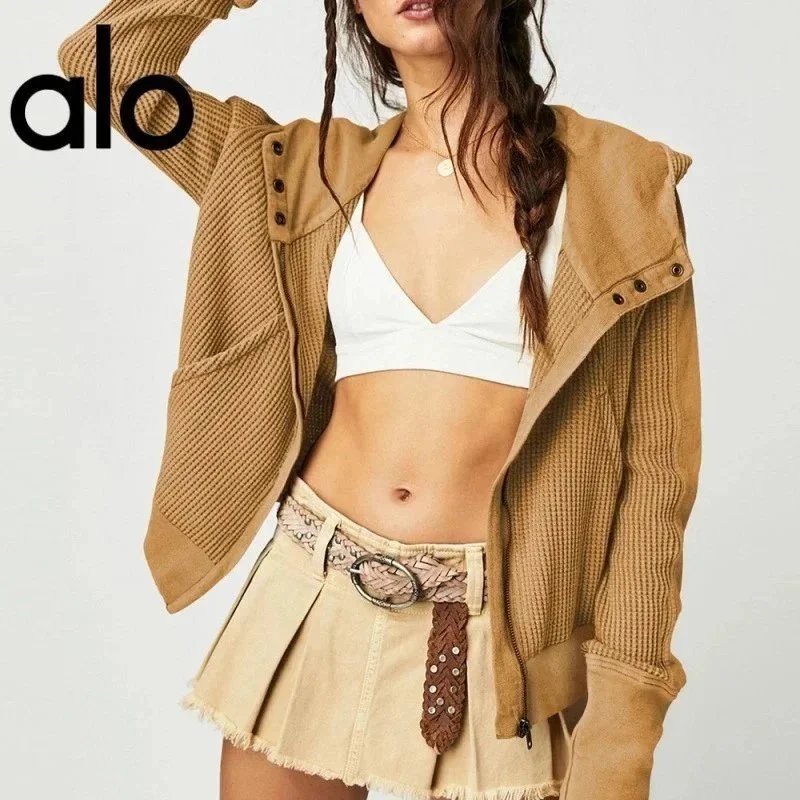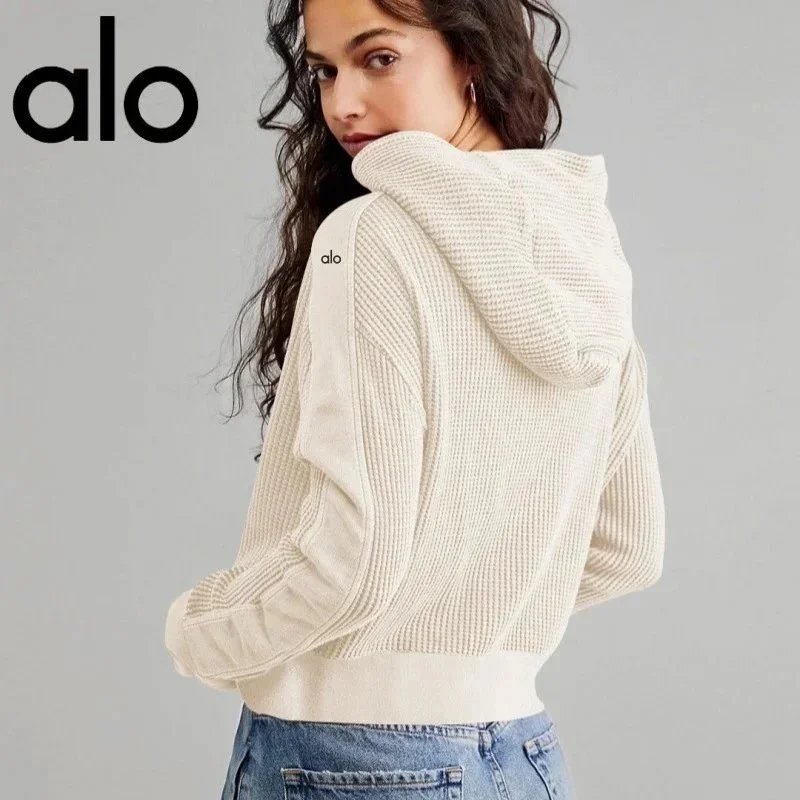ALO原标华夫格面料连帽开衫卫衣女欧美慵懒风拉链连帽外套短款瑜